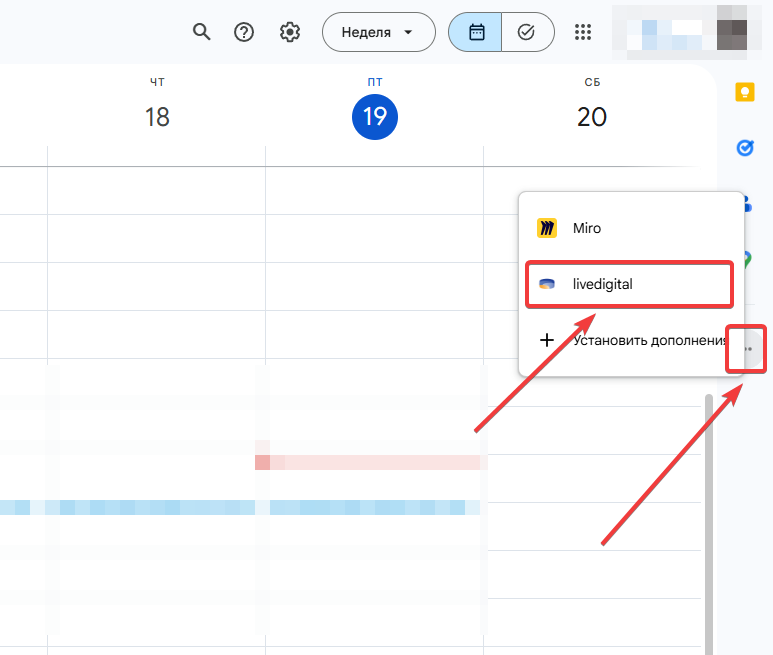 2. Нажмите на "+" в правой боковой панели окна календаря и в поиске найдите приложение "livedigital" или скачайте его по ссылке