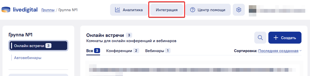 1. Войдите в свою учетную запись livedigital, пройдите на страницу списка комнат и нажмите на кнопку "Интеграция" на верхней панели