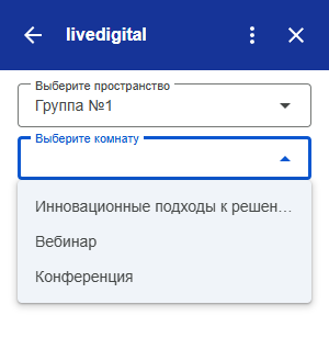6. На вкладке с плагином выберите необходимую группу и комнату, в которой будет проходить мероприятие. После чего сохраните настройки и нажмите «Выбор».