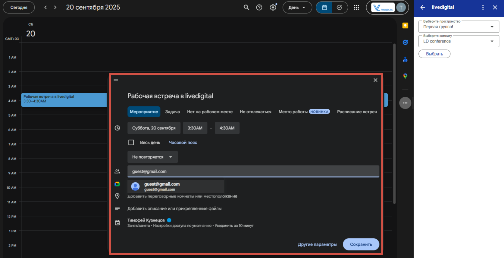 5. Не закрывая вкладку с плагином livedigital, создайте встречу в календаре, добавьте туда участников