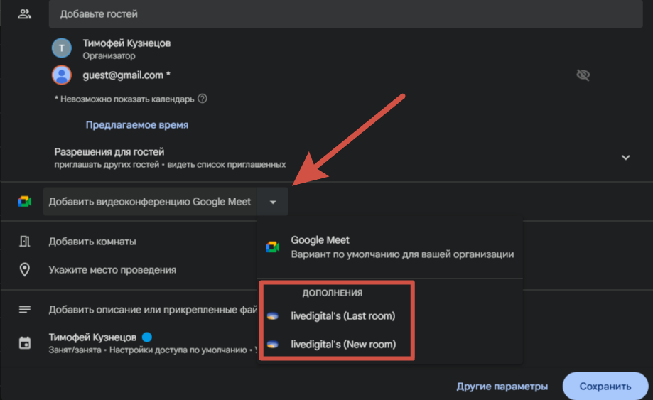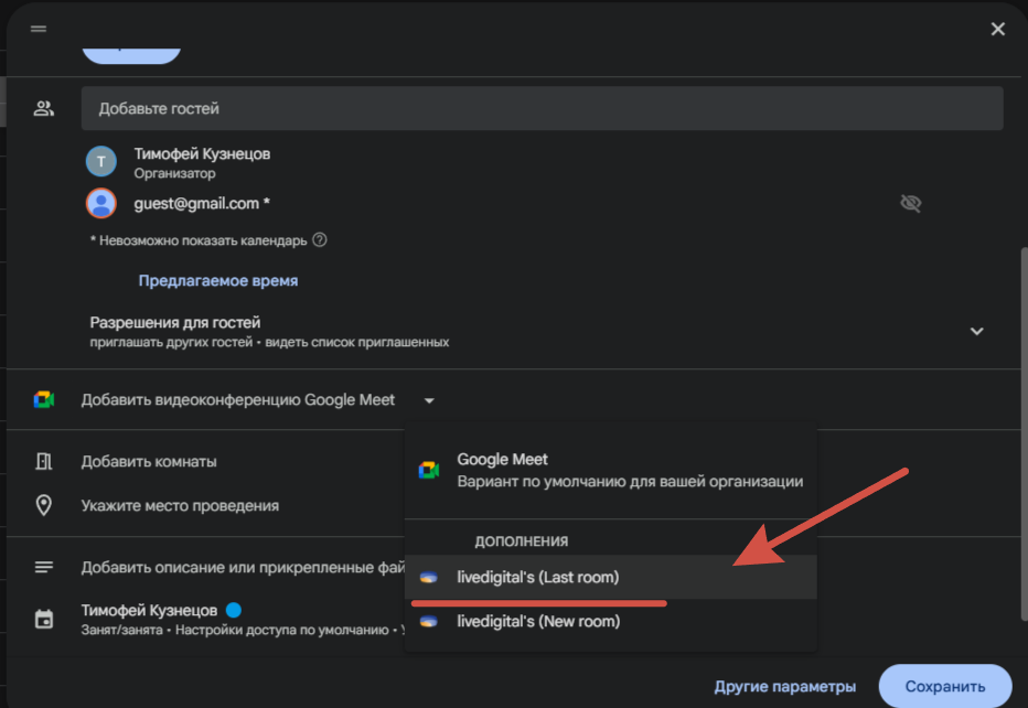 7. В настройках встречи Google Calendar выберите видеоконференцию livedigital. Укажите «Last Room» если нужно провести в