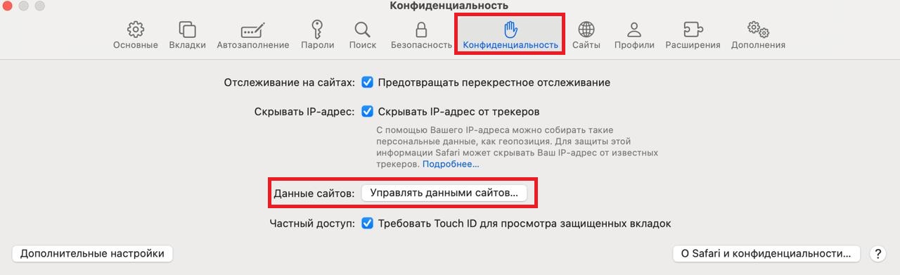 3. Выберите пункт «Конфиденциальность» и перейдите в «Управлять данными веб-сайта».