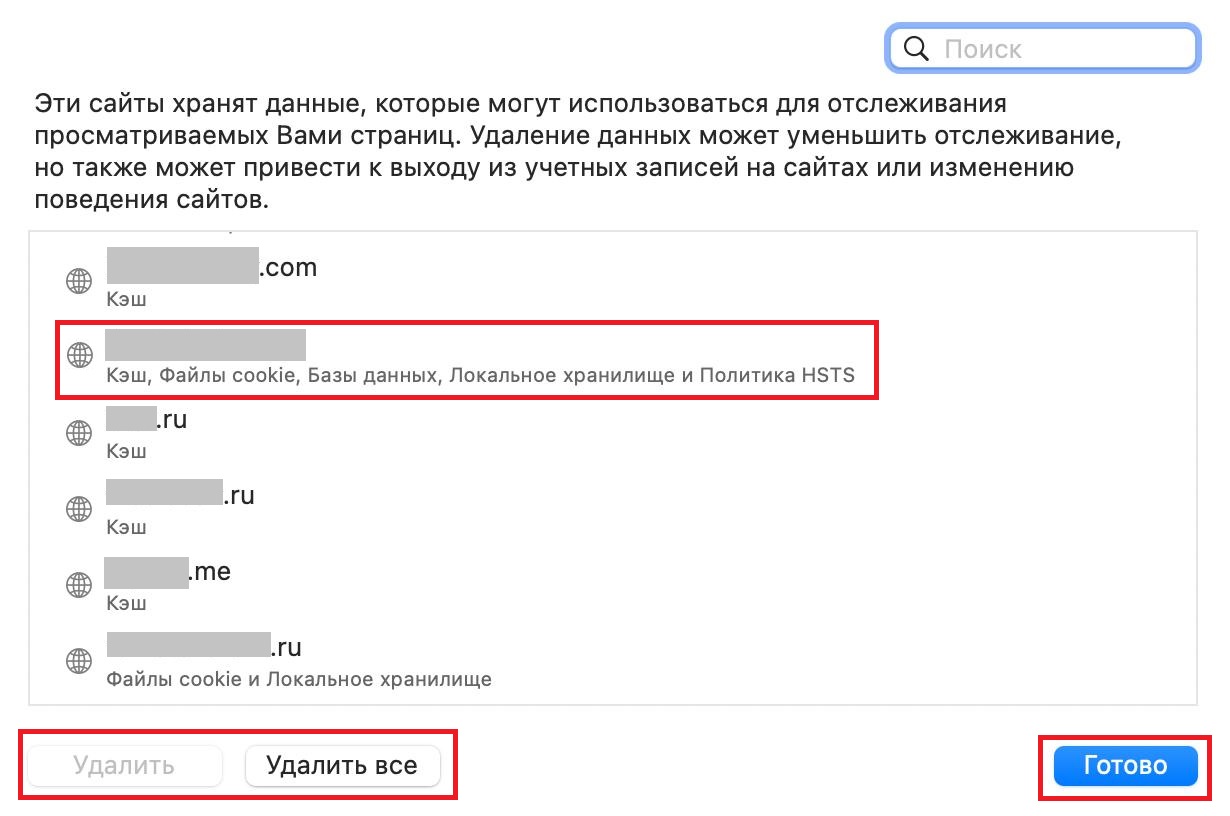 Удалите cookie и кэш-файлы, нажав на иконку мусорного ведра. После удаления кликните по кнопке «Готово» и перезагрузите страницу браузера.