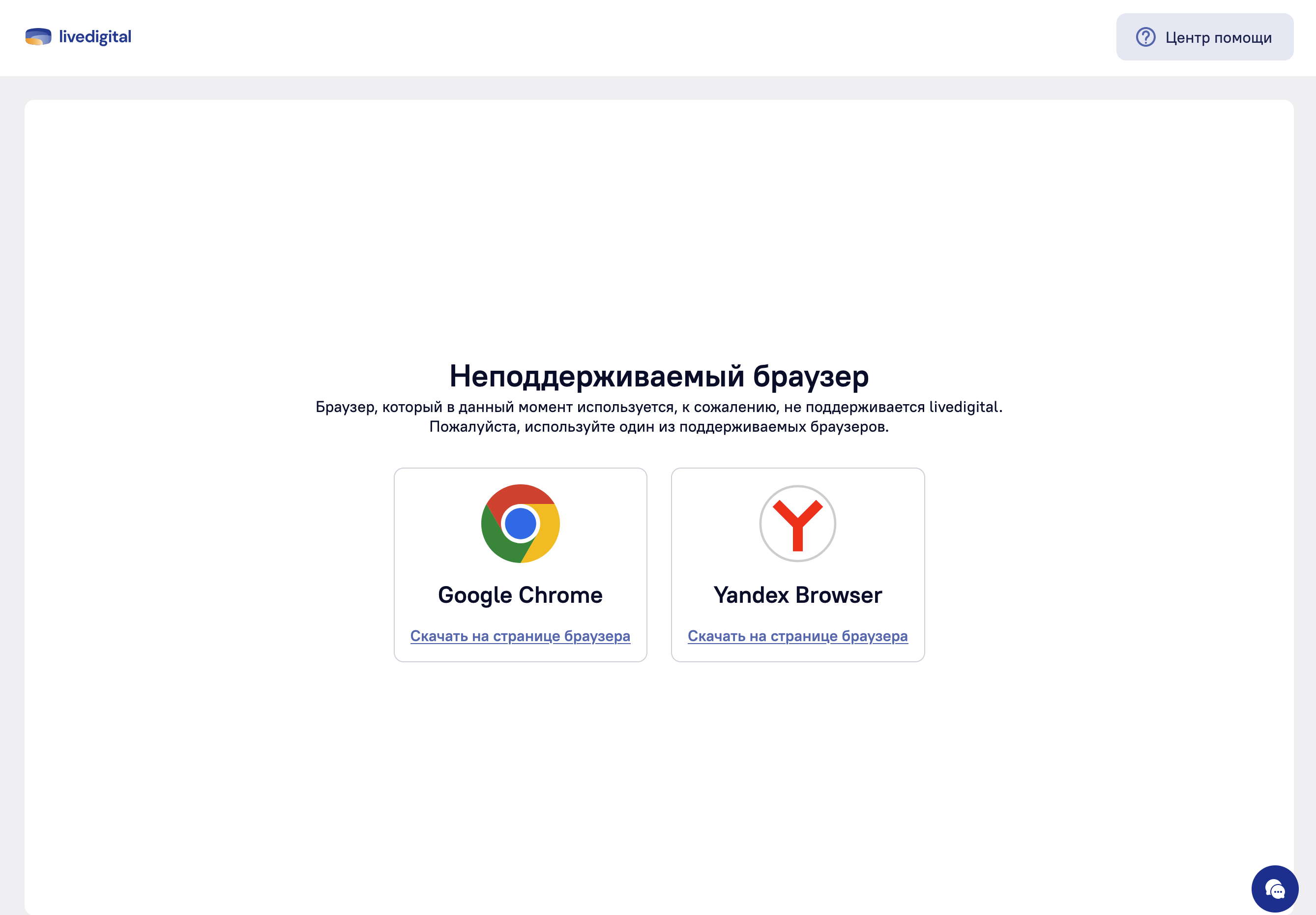 Если на экране отображается уведомление о том, что ваш браузер устарел или не поддерживается livedigital, то рекомендуем изменить ваш текущий браузер на один из списка поддерживаемых.